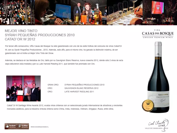 Por tercer año consecutivo, Viña Casas del Bosque ha sido galardonado con uno de los siete trofeos del concurso de vinos Catad’Or W, con su Syrah Pequeñas Producciones , 2010. Además, este año, para el mismo vino, ha ganado la distinción máxima, de ser galardonado con el trofeo al Mejor Vino Tinto del Show.