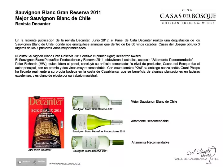 El Sauvignon Blanc Pequeñas Producciones y Reserva 2011, obtuvieron 4 estrellas, es decir, “Altamente Recomendado” Peter Richards (MW), quien lidera el panel, concluyó su artículo comentado: “a nivel de productor, Casas del Bosque fue el actor principal, con un premio y dos vinos muy recomendable. Con sobrebombre “Kiwi” su enólogo neozelandés Grant Phelps ha llegado realmente a su propia bodega en la costa de Casablanca, que se beneficia de algunas plantaciones en laderas excelentes, y es digno de elogio por su trabajo magistral.