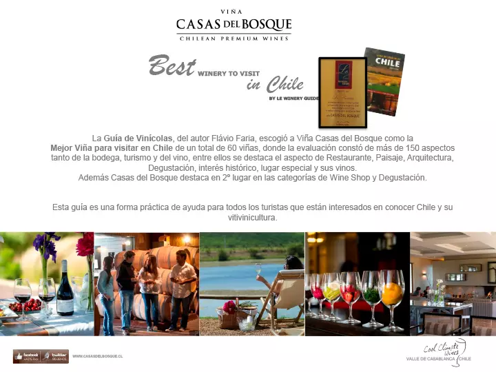 La Guía de Vinícolas, del autor Flávio Faria, escogió a Viña Casas del Bosque como la Mejor Viña para visitar en Chile de un total de 60 viñas, donde la evaluación constó de más de 150 aspectos tanto de la bodega, turismo y del vino, entre ellos se destaca el aspecto de Restaurante, Paisaje, Arquitectura, Degustación, interés histórico, lugar especial y sus vinos.