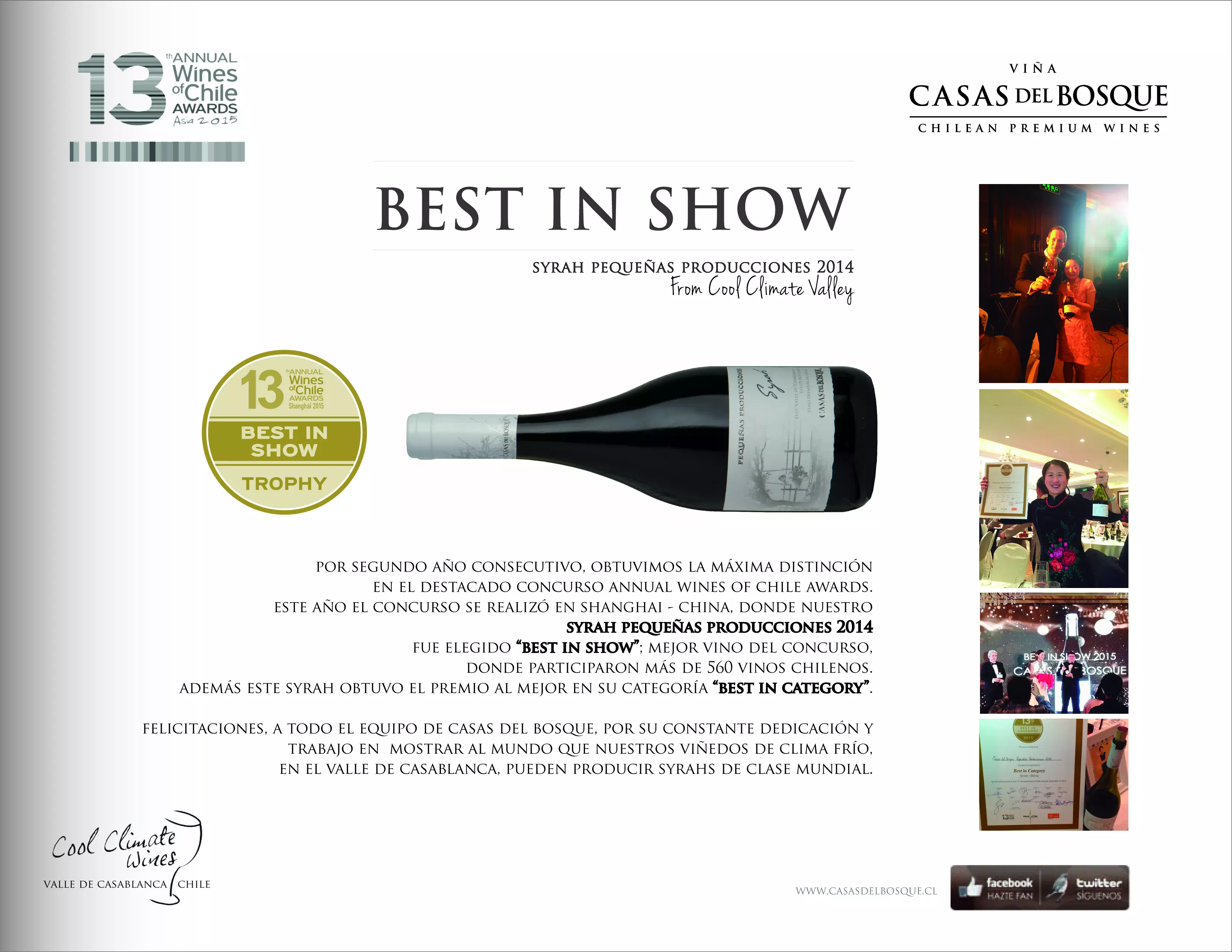 Por segundo año consecutivo, obtuvimos la máxima distinción en el destacado concurso Annual Wines of Chile Awards, este año el concurso se realizó en Shanghai – China, donde nuestro Syrah Pequeñas Producciones 2014 fue elegido “Best in Show“: mejor vino del concurso, donde participaron más de 560 vinos chilenos. Además este syrah obtuvo el premio al mejor en su categoría “Best in Category“.