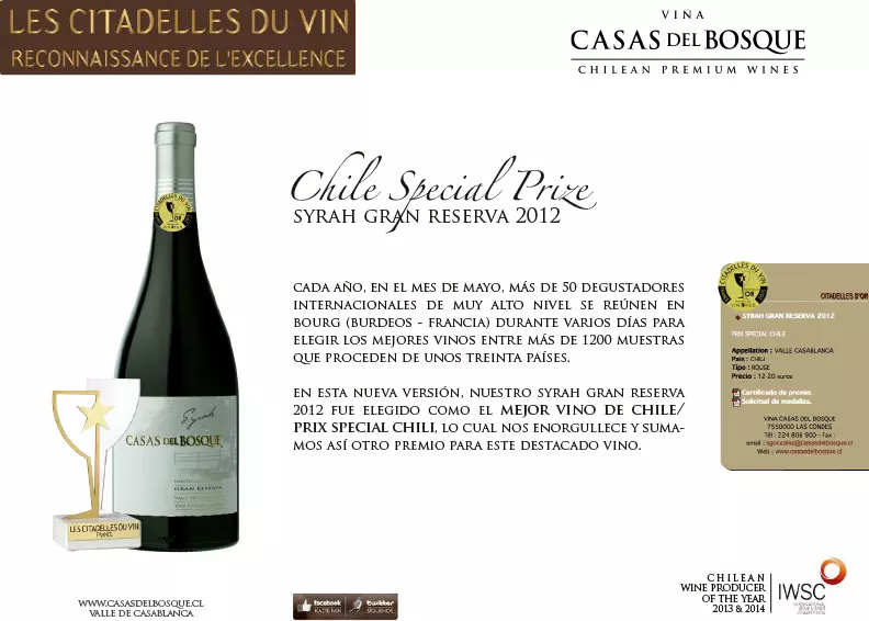 En esta nueva versión, nuestro Syrah Gran Reserva 2012 fue elegido como el mejor vino de Chile Prix Special Chili, lo cual nos enorgullece y sumamos así otro premio para este destacado vino