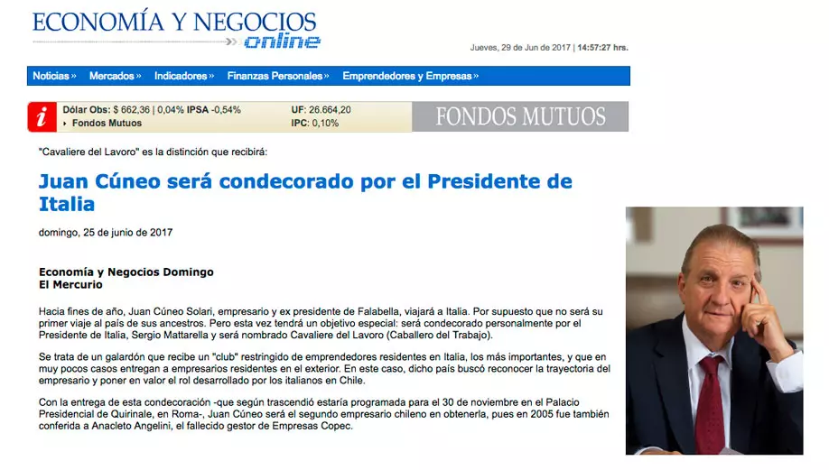 Hacia fines de año, Juan Cúneo Solari, empresario y ex presidente de Falabella, viajará a Italia. Por supuesto que no será su primer viaje al país de sus ancestros. Pero esta vez tendrá un objetivo especial: será condecorado personalmente por el Presidente de Italia, Sergio Mattarella y será nombrado Cavaliere del Lavoro (Caballero del Trabajo).