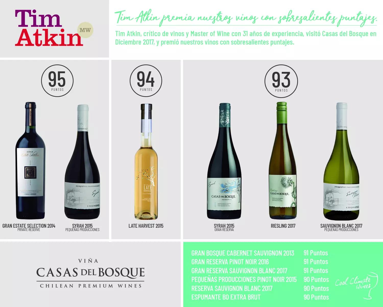 Tim Atkin, crítico de vinos y Master of Wine con 31 años de experiencia, visitó Casas del Bosque en Diciembre 2017, y premió nuestros vinos con sobresalientes puntajes.