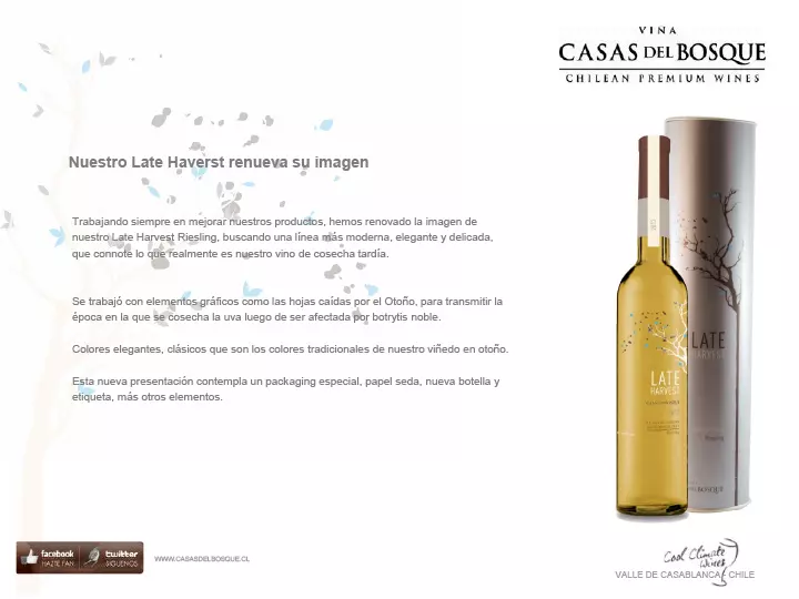 Trabajando siempre en mejorar nuestros productos, hemos renovado la imagen de nuestro Late Harvest Riesling, buscando una línea más moderna, elegante y delicada, que connote lo que realmente es nuestro vino de cosecha tardía.