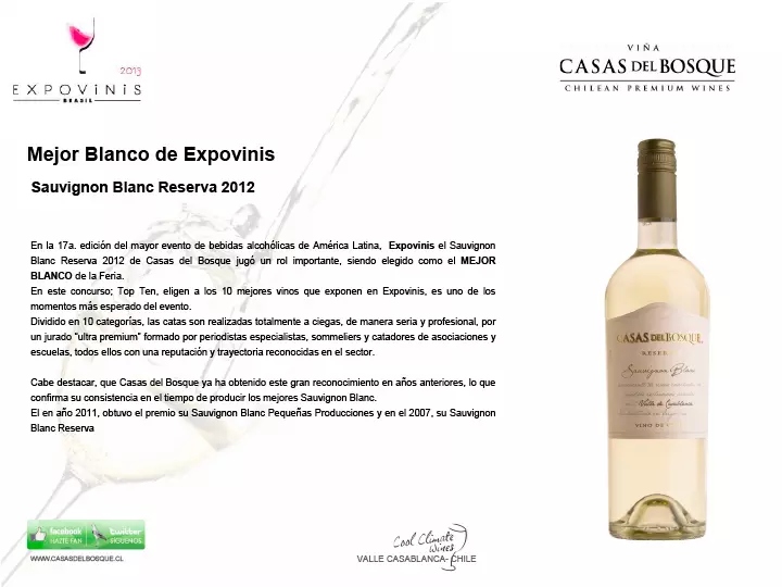 En la 17a. edición del mayor evento de bebidas alcohólicas de América Latina, Expovinis el Sauvignon Blanc Reserva 2012 de Casas del Bosque jugó un rol importante, siendo elegido como el MEJOR BLANCO de la Feria.