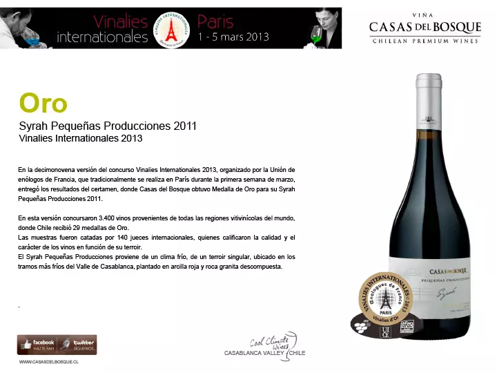 En la decimonovena versión del concurso Vinalies Internationales 2013, organizado por la Unión de enólogos de Francia, que tradicionalmente se realiza en París durante la primera semana de marzo, entregó los resultados del certamen, donde Casas del Bosque obtuvo Medalla de Oro para su Syrah Pequeñas Producciones 2011.