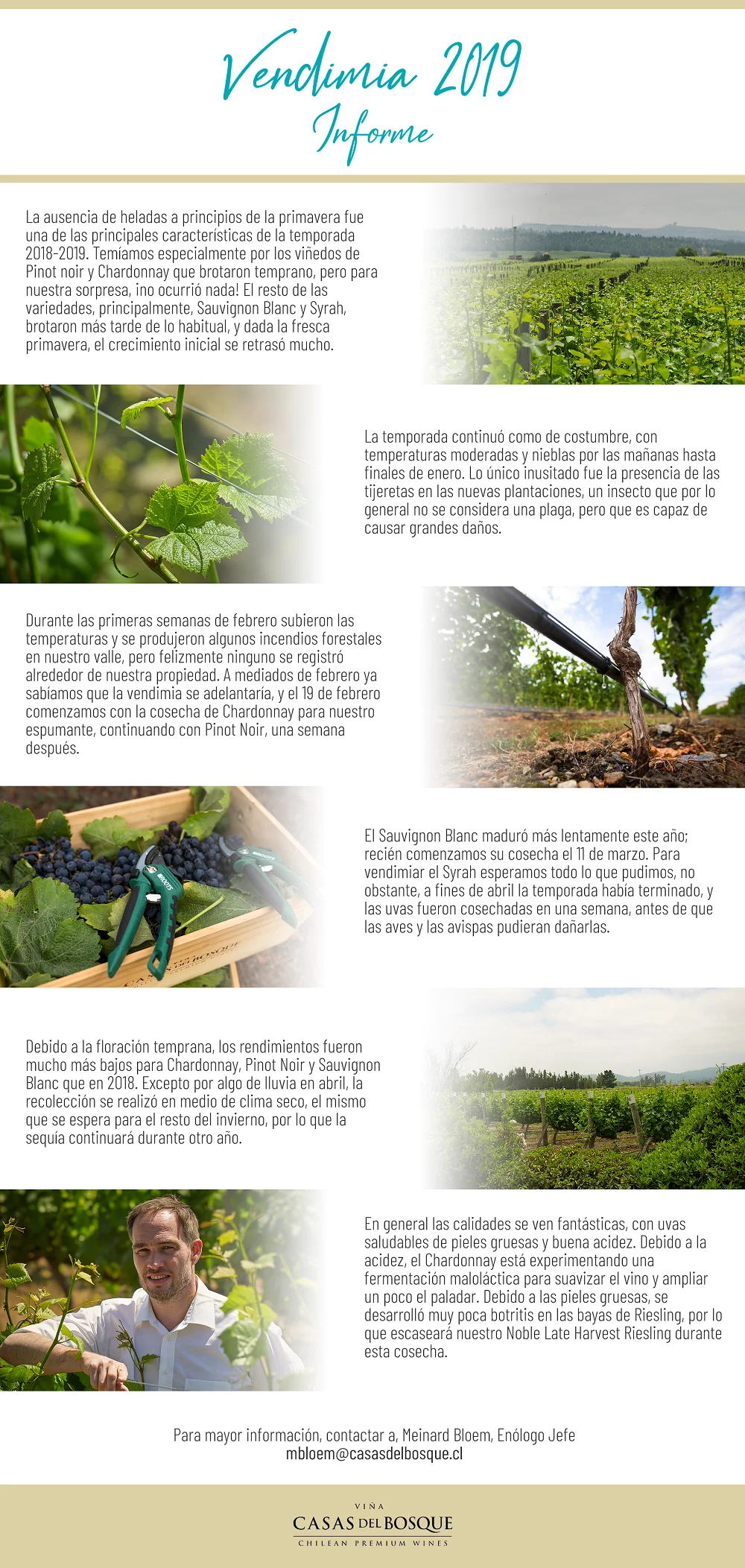 La vendimia 2023 fue desafiante pero llena de sorpresas y aprendizajes. El invierno de 2022 tuvo lluvias superiores a años anteriores, aunque por debajo del promedio de los últimos 15 años. Las heladas primaverales causaron daños importantes en Chardonnay, Pinot Noir y Sauvignon Blanc, con pérdidas de producción del 60% al 80% en algunos cuarteles.